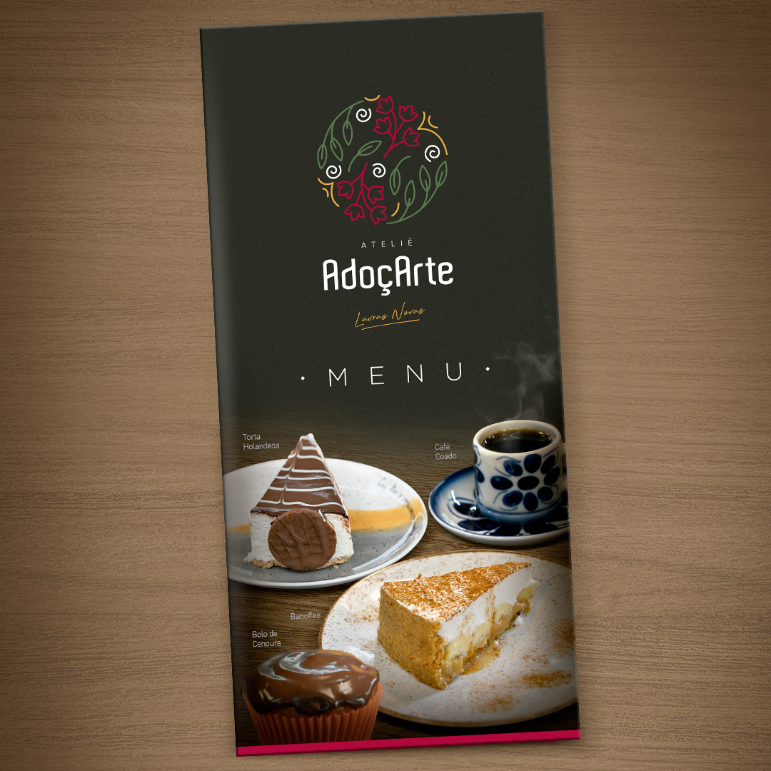 Uma pequena doceria com produção própria encantadora. Um pequeno negócio que, como todo outro, precisa de uma visão estratégica para comunicar-se ao mercado. É aí que entramos! Criamos um cardápio com objetivos bem definidos para, além de informar ao consumidor, promover vendas e incrementar o ticket médio através de uma experiência de consumo e atendimento simples, direta e prazerosa.